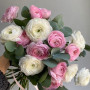 На фото 15 белых и розовых ранункулюсов. В составе: ранункулюс 15 шт, эвкалипт 2 шт, атласная лента 1 шт, . Все цветы свежие и ароматные, букет красиво оформлен и отлично подходит для подарка. Доступна доставка цветов или самовывоз.