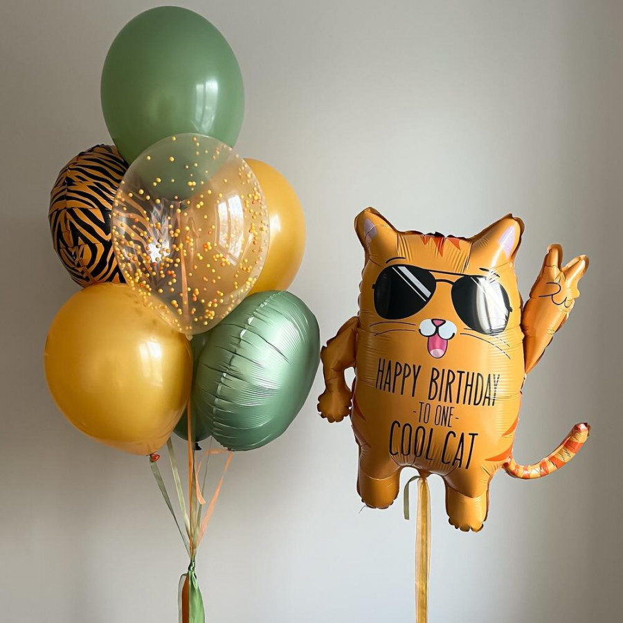 Состав композиции: - фонтан из 4 латексных шариков ( 30 см) , 1 латексный шарик с пенопластом ( 30 см), 2 фольги рванных круга ( 46 см) - фольгированный кот (66 см)